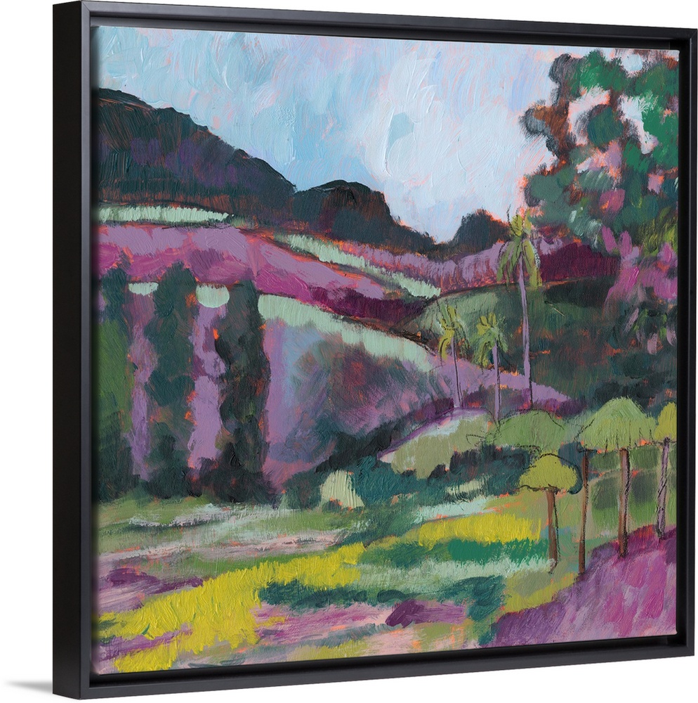 <p>Inspired by an impressionist artist, this countryside landscape painting features a bold palette of pink and green shades.</p>