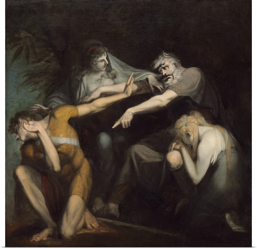 <p>Oedipus Cursing His Son, Polynices, by Henry Fuseli, 1786, British painting, oil on canvas. Henry Fuseli's dramatic painting, depicts the tense climax of 'Oedipus at Colonus', a drama by Sophocles. Self-blinded King Oedipus, condemns his son, to die in ba</p>