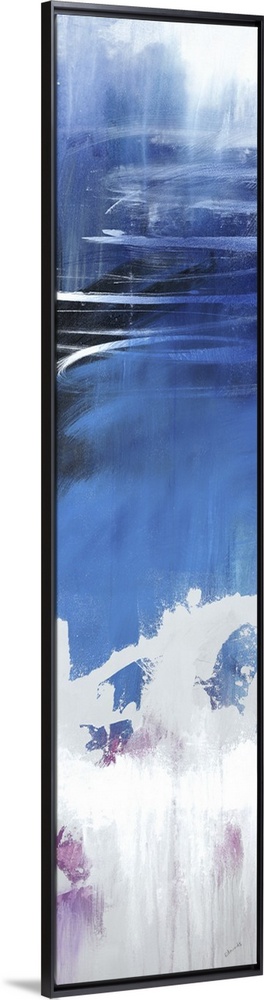<p>Large vertical abstract painting with bold strokes of paint in white, blue and purple.</p>