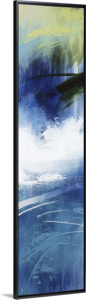 <p>Large vertical abstract painting with bold strokes of paint in white, blue and green.</p>