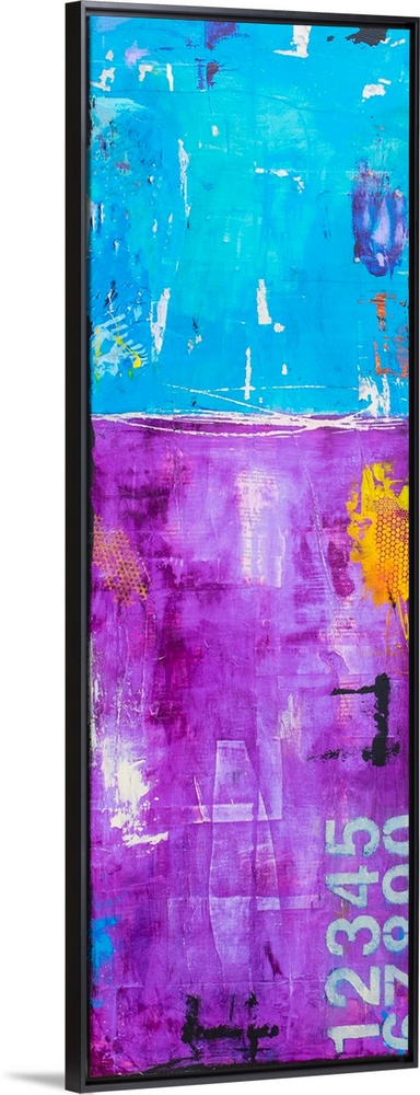 <p>Vertical abstract artwork created with purple and teal with a portrait of a woman on the far left side and numbers on the bottom right.</p>