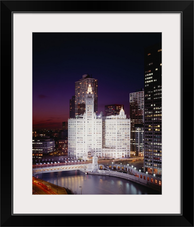 <p>A view of buildings in Chicago at night with the windows illuminated. A bridge and body of water are pictured in front of the buildings.</p>