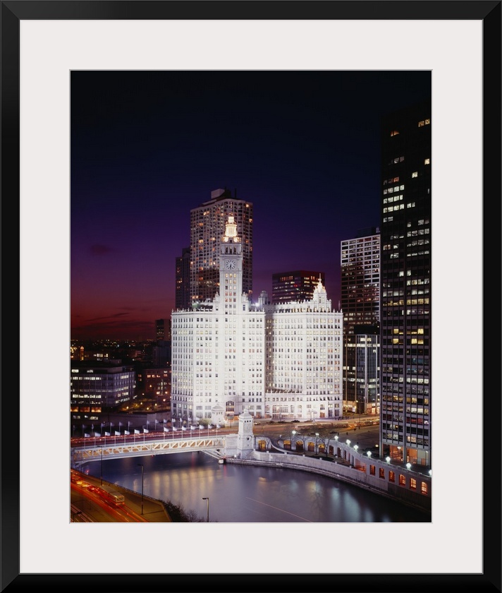 <p>A view of buildings in Chicago at night with the windows illuminated. A bridge and body of water are pictured in front of the buildings.</p>