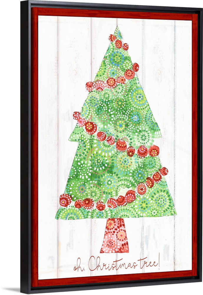 <p>Festive tree on a green on a white washed shiplap. Green and red watercolor patterns.</p>