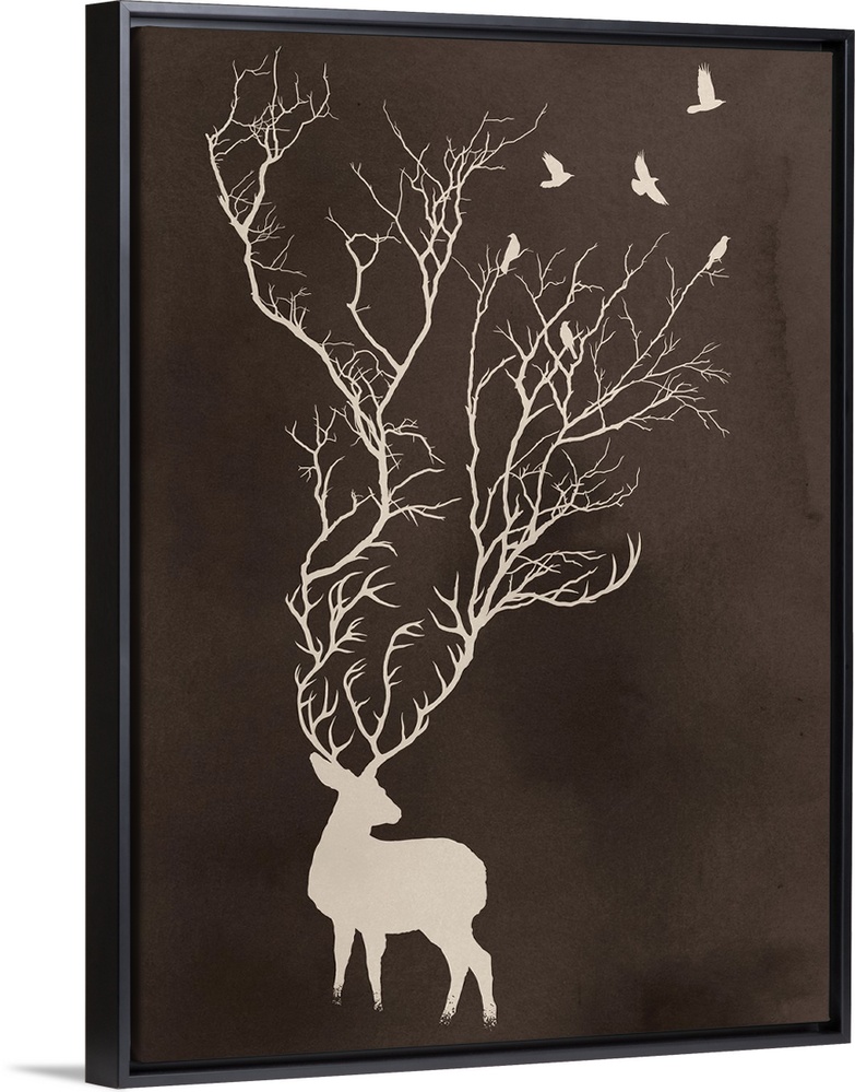 <p>Portrait, large wall art of a white silhouette of a dear standing at the bottom of the image, with antlers that extend the entire height of the image and look like large branches with many tiny branches. A small flock of birds resting or flying away at the top of the antlers.</p>