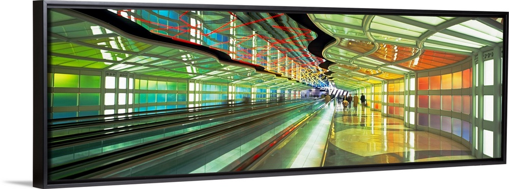 <p>Panoramic photograph of moving sidewalk in airport terminal with people in the distance.</p>
