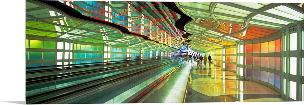 <p>Panoramic photograph of moving sidewalk in airport terminal with people in the distance.</p>