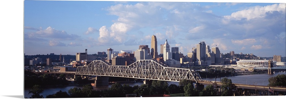 <p>Wide angle photograph taken of the Cincinnati skyline from a distance with a clear view of the bridge into the city.</p>