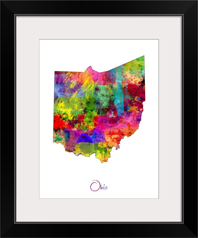 <p>Contemporary artwork of a map of Ohio made of colorful paint splashes.</p>