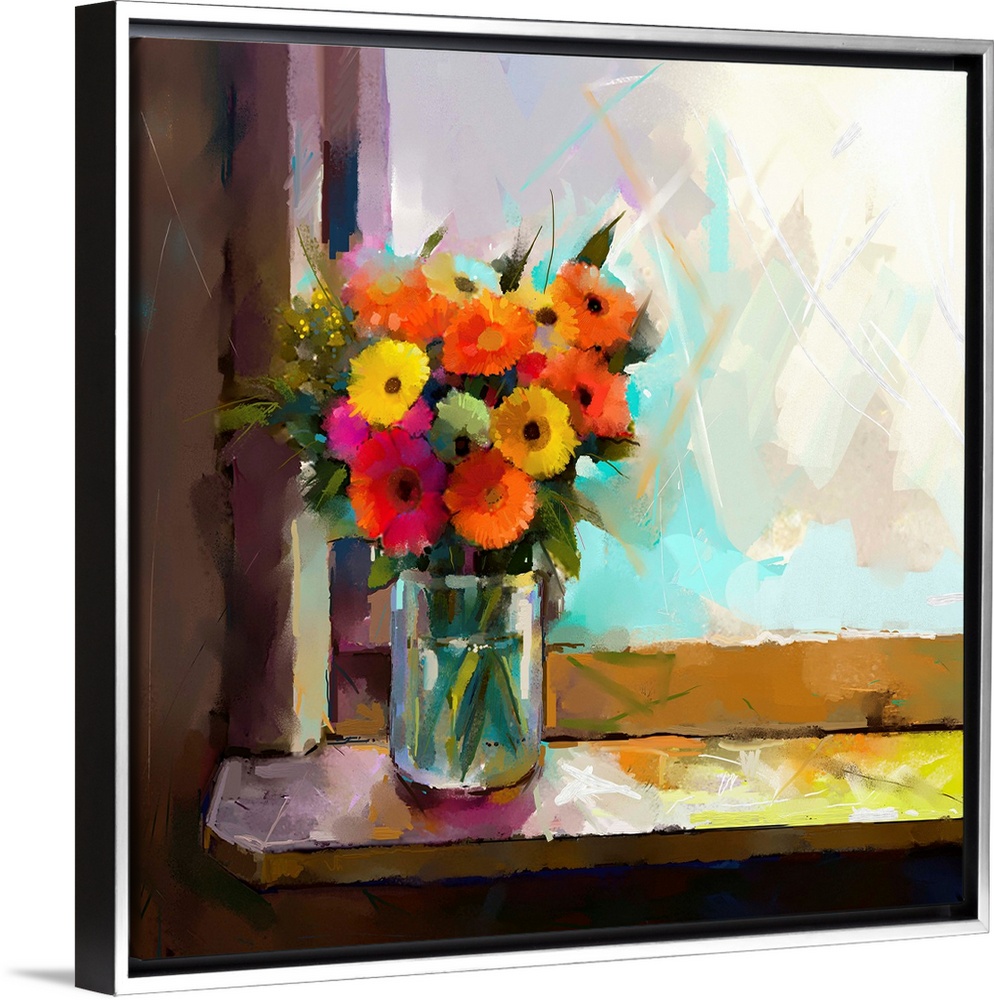 <p>Oil painting of a flowers in a glass vase on a window sill.</p>