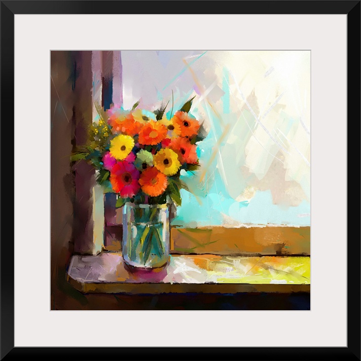 <p>Oil painting of a flowers in a glass vase on a window sill.</p>