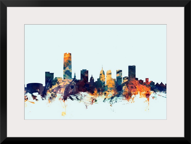 <p>Dark watercolor silhouette of the Oklahoma city skyline against a light blue background.</p>
