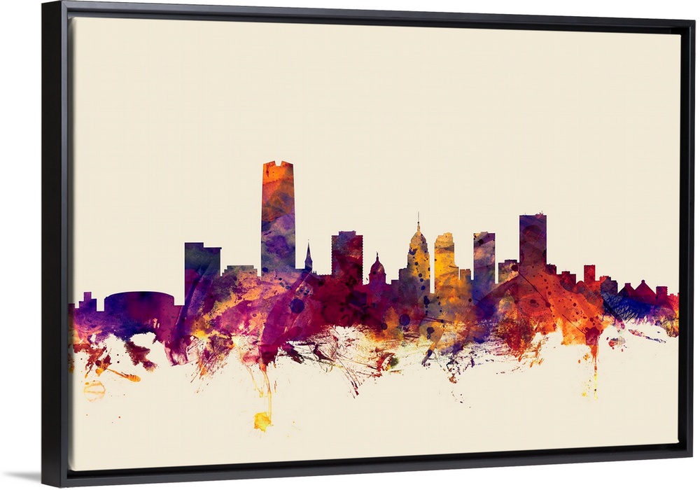 <p>Dark watercolor splattered silhouette of the Oklahoma city skyline.</p>
