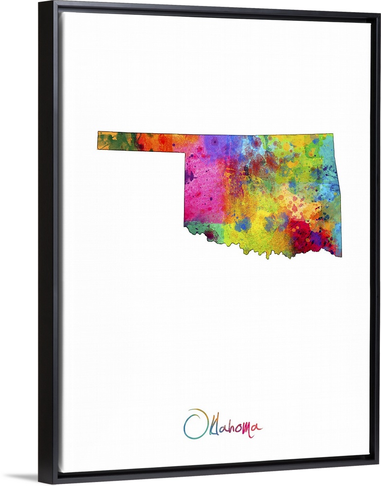 <p>Contemporary artwork of a map of Oklahoma made of colorful paint splashes.</p>