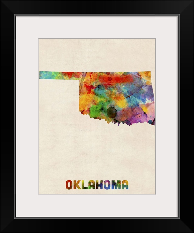 <p>Contemporary piece of artwork of a map of Oklahoma made up of watercolor splashes.</p>