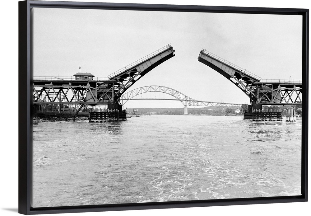 <p>6/10/1935-Bourne, MA- The opening of the new Buzzards Bay Railroad Bridge across the Cape Cod Canal will be marked by a huge celebration on the part of Cape Cod residents. In this picture, the old and the new bridges form a great contrast. The bridge in the foregreound, spanning the Cape Cod Canal at Bourne, is a scant 6 feet above the water when closed. The new bridge, its graceful arches visible in the rear, clears the channel by 136 feet, permitting passage of vessels of all sizes.</p>