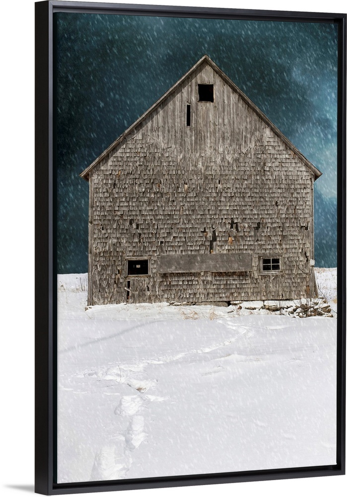 <p>An old abandoned barn in a winter snow storm with footprints.</p>
