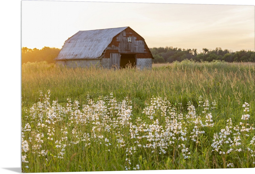 <p>Old barn and field of penstemon at sunset Prairie Ridge State Natural Area, Marion County, Illinois</p>