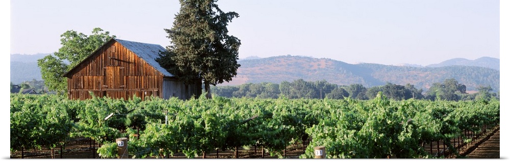 <p>Panoramic print of an old barn house amonst a vineyard with rolling hills in the distance.</p>