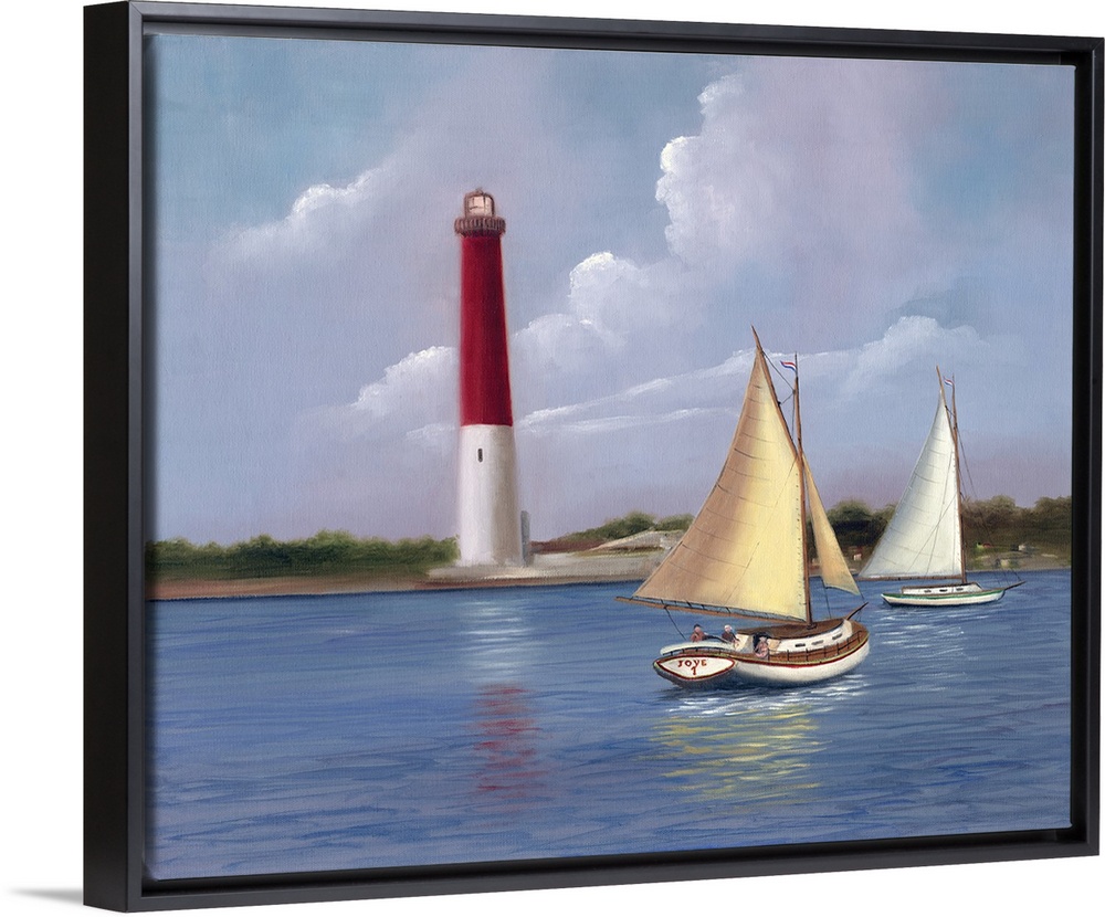 <p>Painting of two sailboats on the water near a red and white lighthouse.</p>