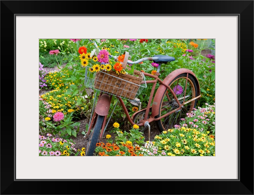 <p>Old bicycle with flower basket in a garden with zinnias, marion county, illinois, USA.</p>