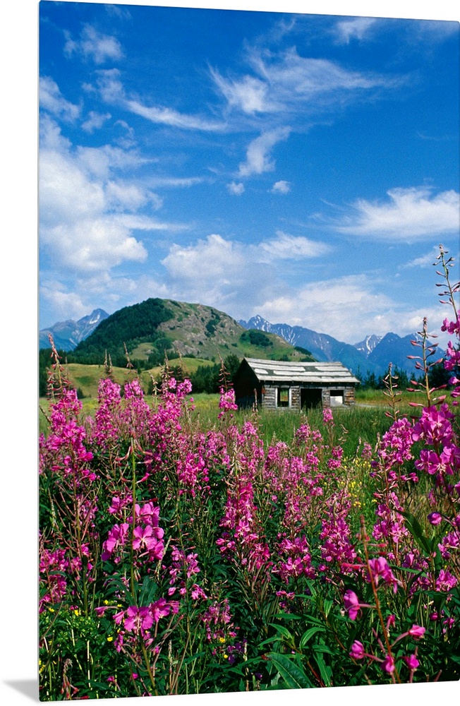 <p>Wooden shack in front of a mountain range in a field of wildflowers in Alaska.</p>