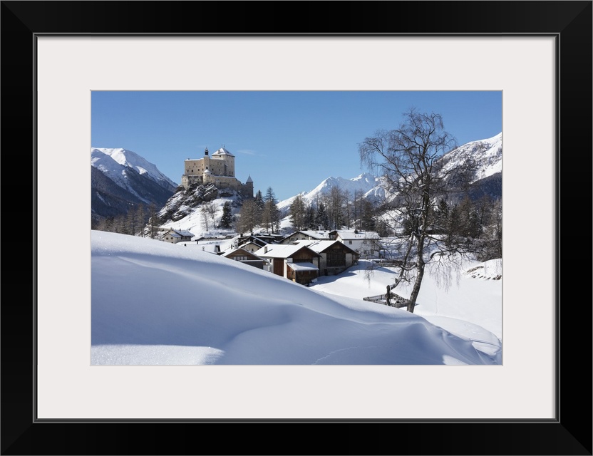 <p>Old castle and alpine village of Tarasp surrounded by snowy peaks, Inn district, Canton of Graubunden, Engadine, Switzerland, Europe</p>