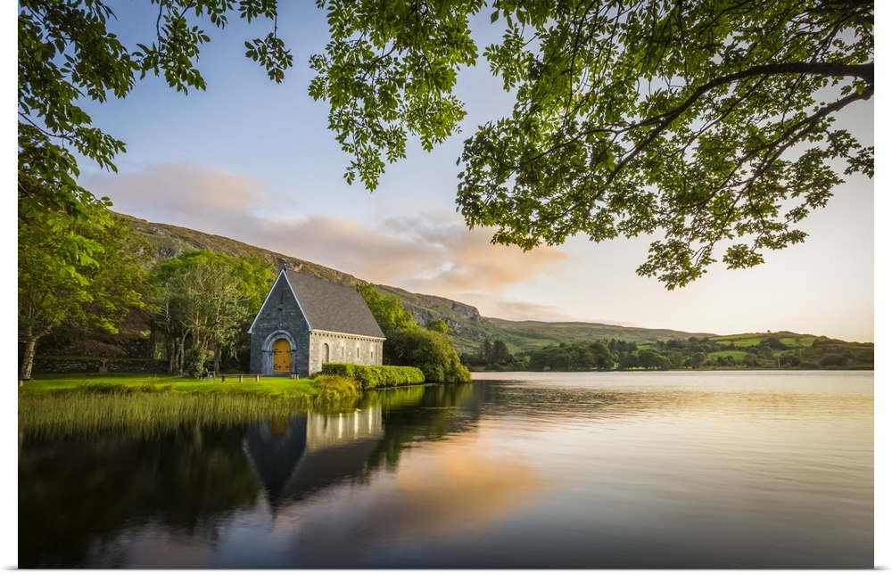 <p>Old chapel of Gougane Barra situated by a lake and framed by green trees at sunrise; Gougane Barra, County Cork, Ireland.</p>