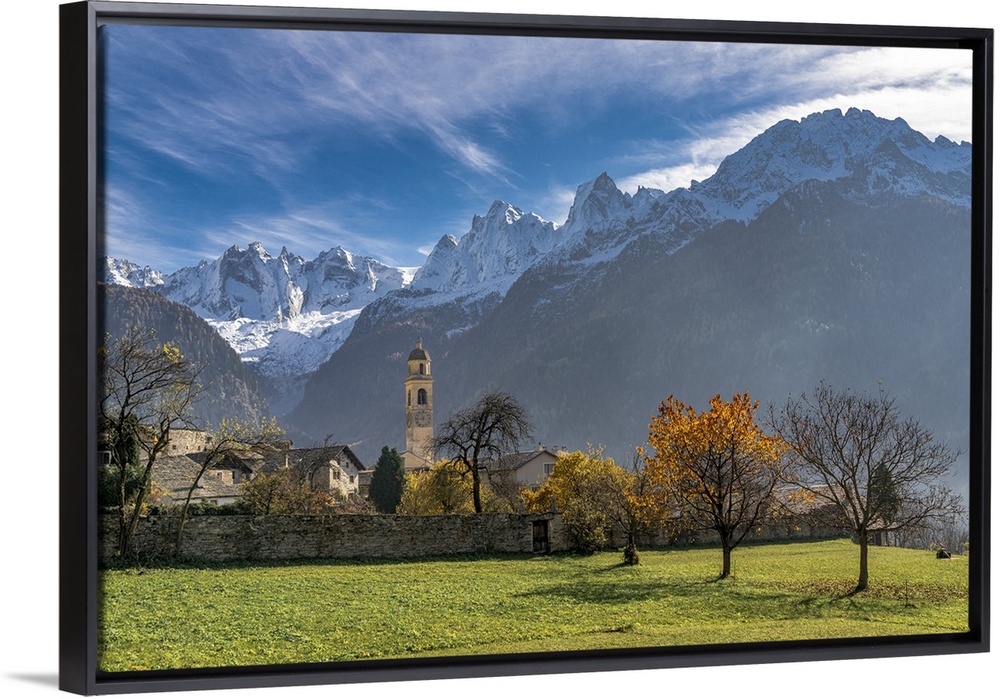 <p>Old church and snowcapped Sciore mountains in autumn, Soglio, Val Bregaglia, Graubunden canton, Switzerland</p>