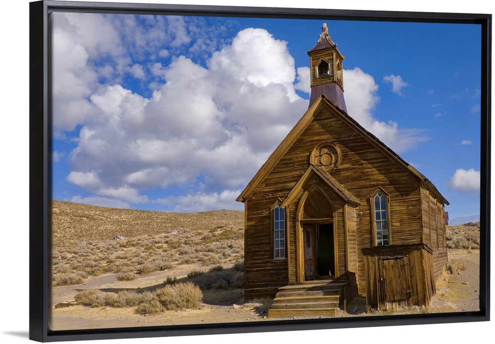 <p>Large, horizontal photograph of a small, old wooden church surrounded by empty dessert, beneath a blue sky with fluffy clouds in Bodie, California</p>