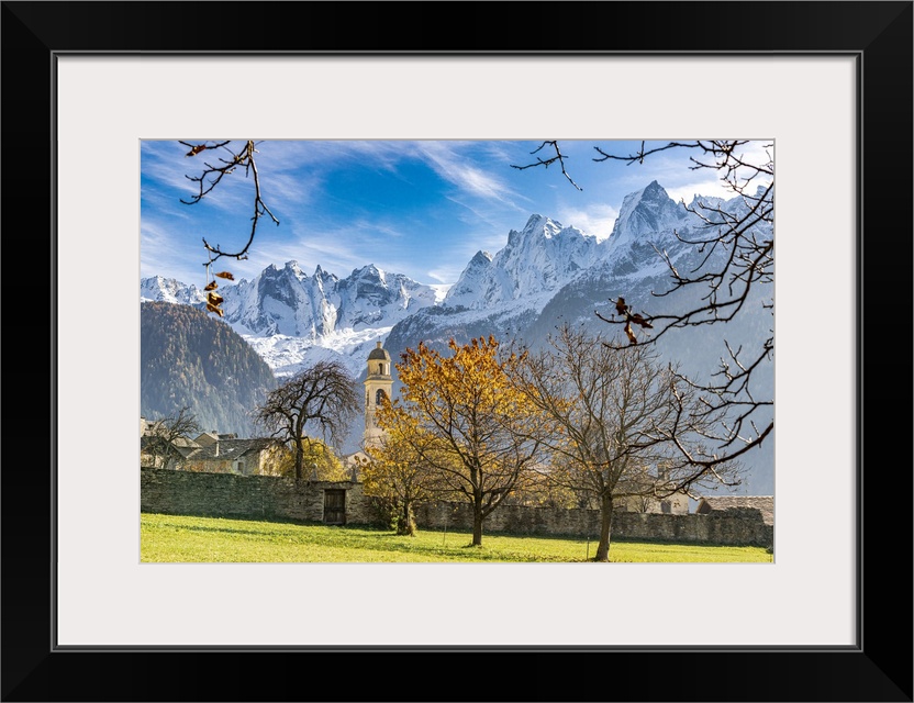 <p>Old church lit by autumn colors with snowcapped Piz Badile and Cengalo in the background, Soglio, Graubunden, Switzerland, Europe</p>