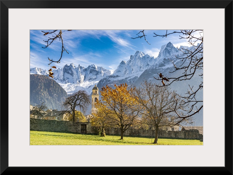 <p>Old church lit by autumn colors with snowcapped Piz Badile and Cengalo in the background, Soglio, Graubunden, Switzerland, Europe</p>