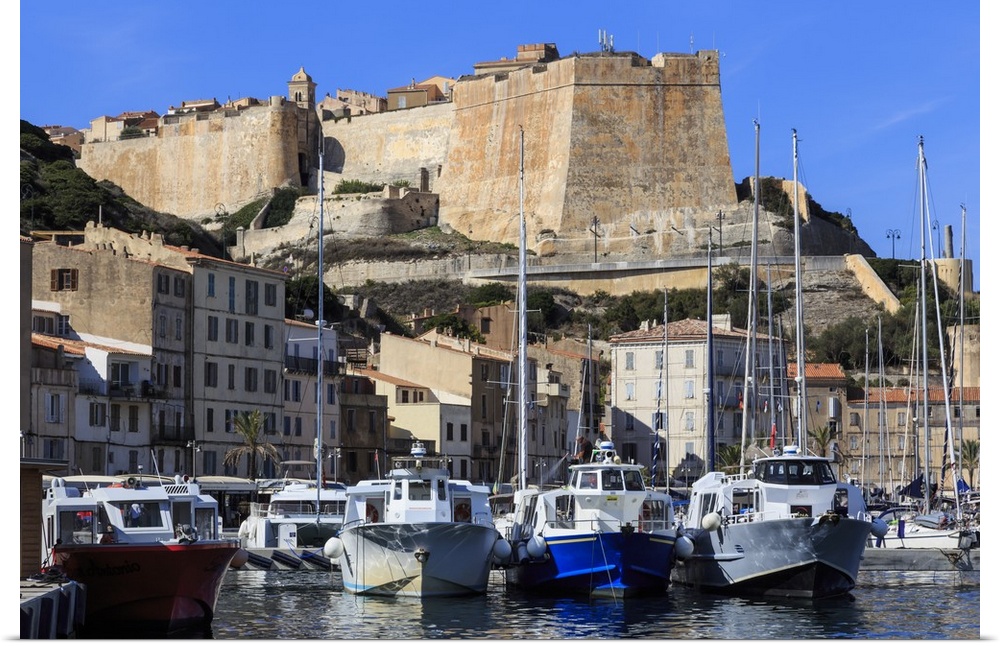 <p>Old citadel view with yachts in the marina, Bonifacio, Corsica, France, Mediterranean, Europe</p>
