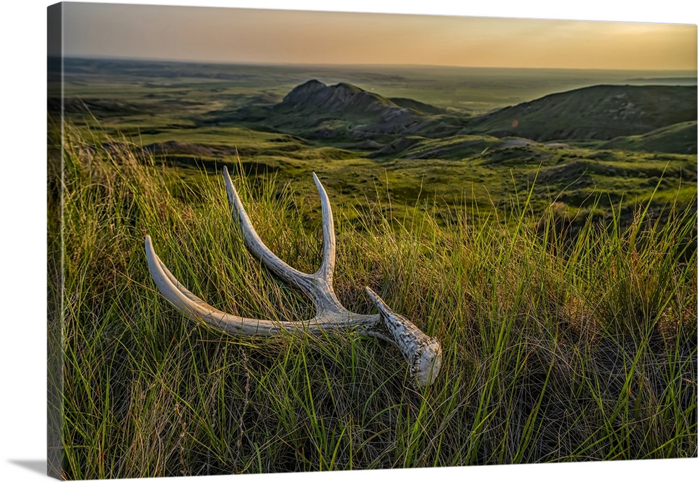 <p>Old deer antler laying in the grass at dusk in Grasslnds National Park; Val Marie, Saskatchewan, Canada.</p>