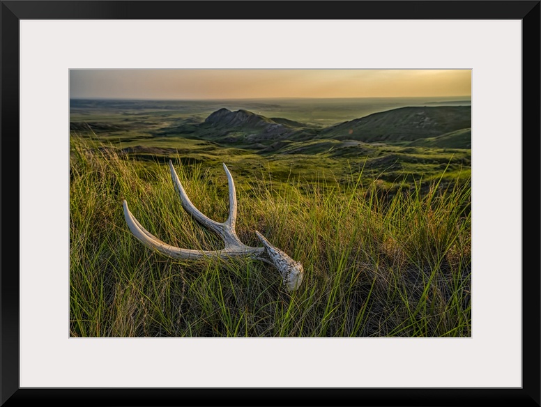 <p>Old deer antler laying in the grass at dusk in Grasslnds National Park; Val Marie, Saskatchewan, Canada.</p>