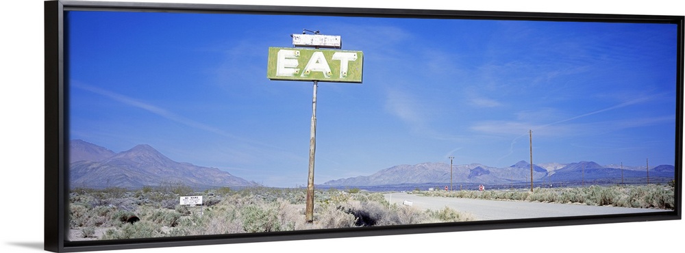 <p>A large sign with the word Eat stands alone in the desert with mountainous terrain lining the background.</p>