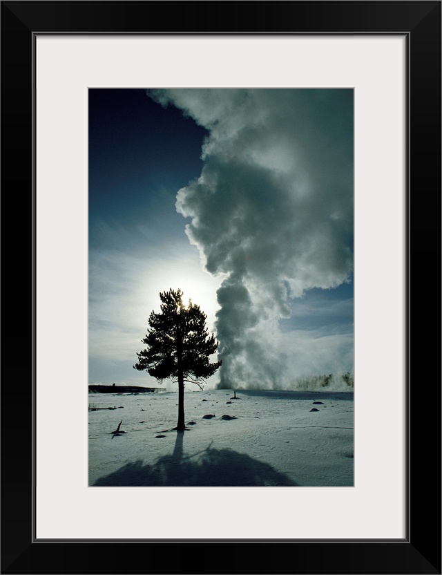 <p>Large vertical piece of an active geyser during the winter. A single tree is silhouetted just in front of the geyser and the sun.</p>