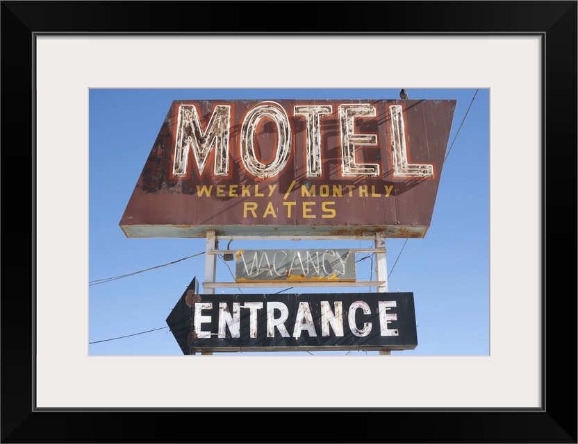 <p>USA, Arizona, Winslow, Old-fashioned motel sign against blue sky</p>