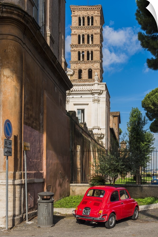 <p>Old Fiat 500 car parked with Basilica dei Santi Bonifacio ed Alessio in the background, Rome, Lazio, Italy.</p>