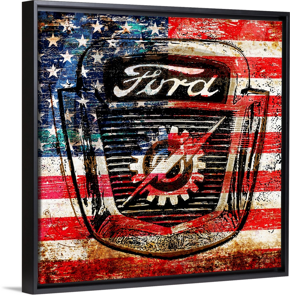 <p>A worn, distressed, cracked and rusty Ford logo with the American flag superimposed.</p>