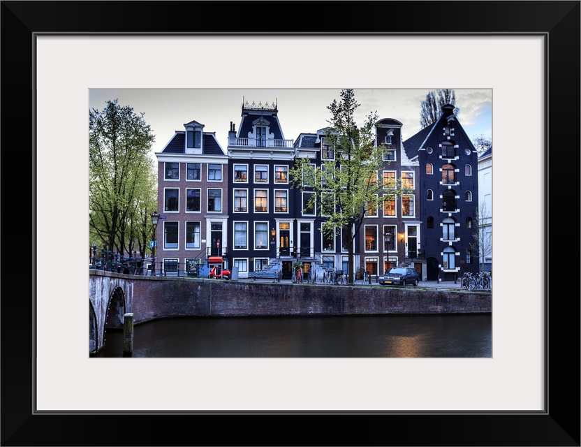 <p>Old gabled houses line the Keizersgracht canal at dusk, Amsterdam, Netherlands, Europe.</p>