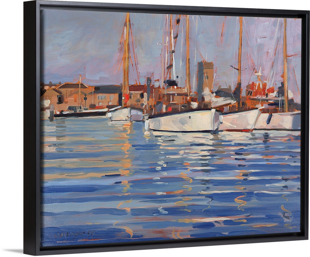 <p>Contemporary painting of fishing boats in a harbor.</p>