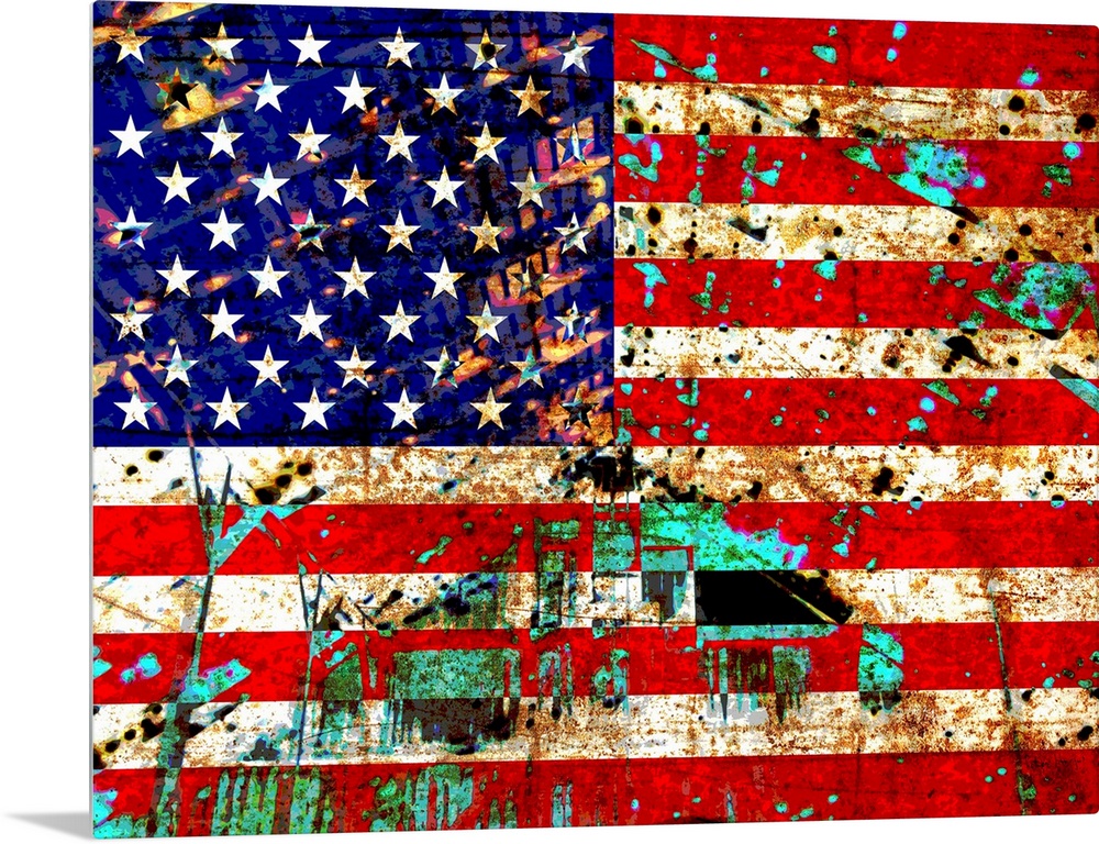 <p>A torn and distressed american flag with an old barn and rust texture in the background.</p>