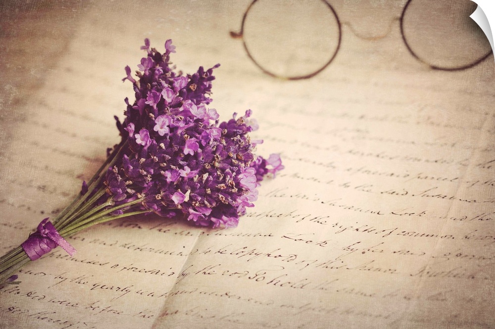 <p>Old handwritten letter, pair of old fashioned round horn rimmed glasses and posy of lavender.</p>