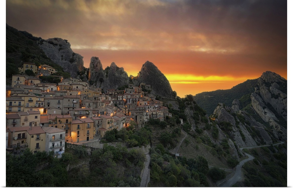 <p>Burning sky at sunrise over the old houses of Castelmezzano and Dolomiti Lucane mountains, Potenza province, Basilicata, Italy, Europe</p>