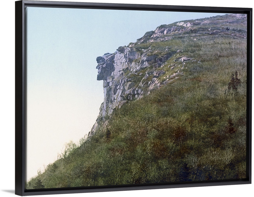<p>Photo on canvas of the face of a man made out of rocks hanging on a cliff of a mountain.</p>