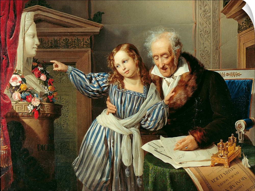 <p>Old Man Showing His Little Niece the Herm of Maria Luigia, by Giuseppe Molteni, 1830, 19th Century, oil on canvas, cm 99,1 x 130 - Italy, Emilia Romagna, Parma, National Art Gallery. All. Grandfather old man elder man shirt dressing gown robe fur little g</p>