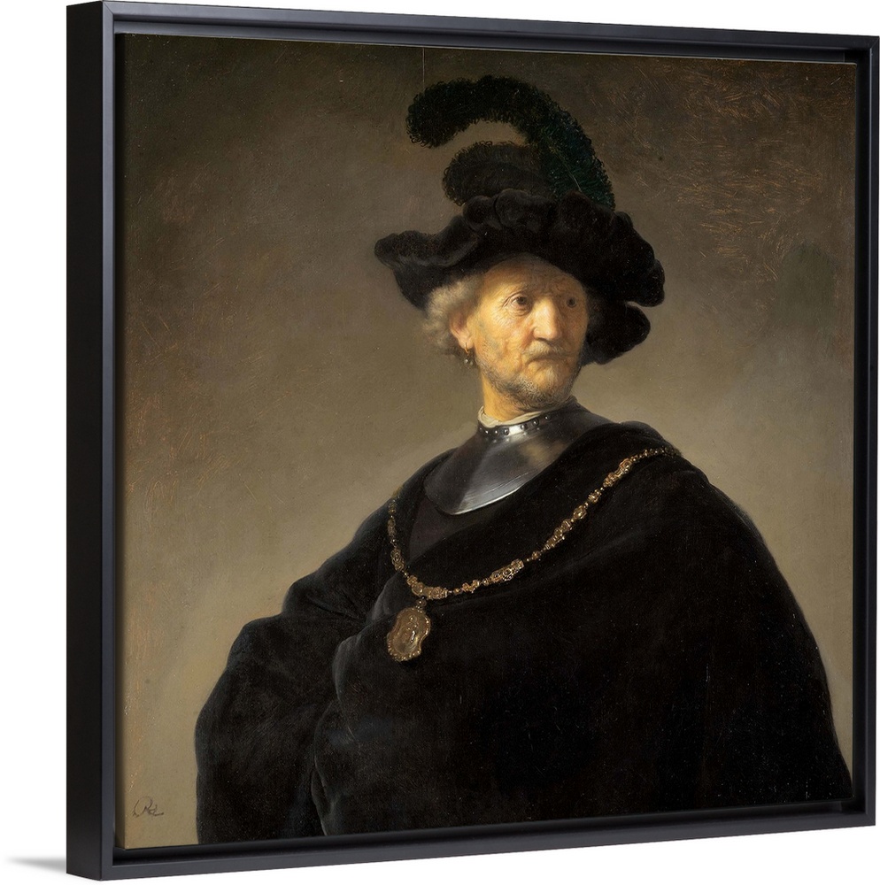 <p>This evocative character study is an early example of a type of subject that preoccupied the great Dutch master Rembrandt van Rijn throughout his long career. Although his large output included landscapes, genre paintings, and the occasional still life, he focused on biblical and historical paintings and on portraits. As an extension of these interests, the artist studied the effect of a single figure, made dramatic through the use of costume and rich, subtle lighting. Rembrandt collected costumes to transform his models into characters. Here, the gold chain and steel gorget suggest an honored military career, while the plumed beret evokes an earlier time. The broad black mass of the old man's torso against a neutral background is a powerful foil for these trappings. The face is that of a real person, weathered and watchful, glowing with pride and humanity. The unidentified sitter, once thought to be the artist's father, was a favorite model, appearing in many of the artist's early works. The confident execution suggests that the young Rembrandt completed this picture about 1631, when he had left his native Leiden to pursue a career in the metropolis of Amsterdam; perhaps he wished to use this work to demonstrate his skill in a genre that combined history painting and portraiture.</p>