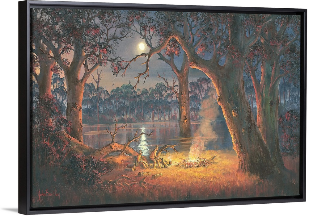 <p>Contemporary painting of old friends sitting beside a roaring campfire at night.</p>