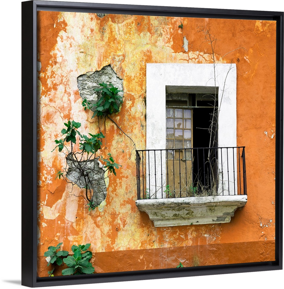 <p>Square photograph of a rustic balcony with orange chipping paint and new plant growth on the exterior wall. From the Viva Mexico Square Collection.</p>